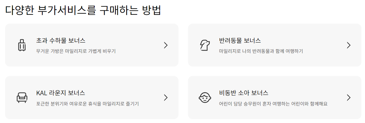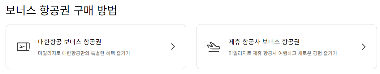 - 보너스 항공권 구매: 마일리지로 국내 및 국제선 보너스 항공권 구매