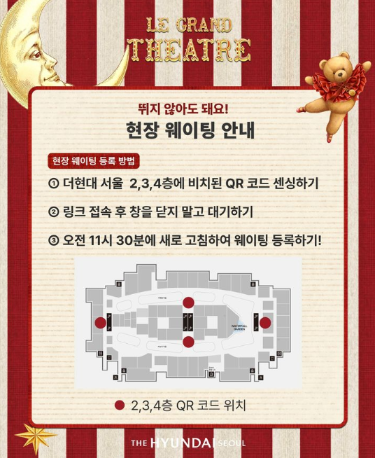 - 더현대 서울 2층, 3층, 4층에 비치된 QR코드를 스캔하여 웨이팅 등록.