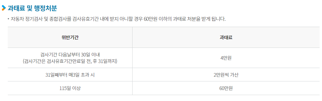 검사기간 다음날부터 30일이내는 4만 원이며 31일째부터 매 3일 초과 시 2만 원식 가산되며 최대 60만 원까지 과태료가 발생할 수도 있습니다.