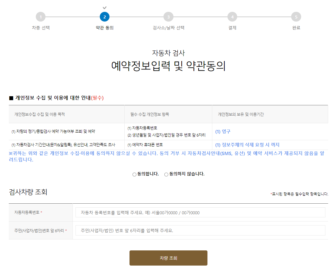 약관에 동의를 하신 후 검사차량 조회에 자동차등록번호, 주민번호 앞 6자리 혹은 사업자/법인 법호를 입력한 후 차량조회를 클릭해 주시면 됩니다.