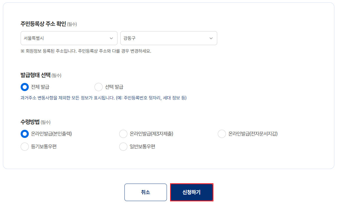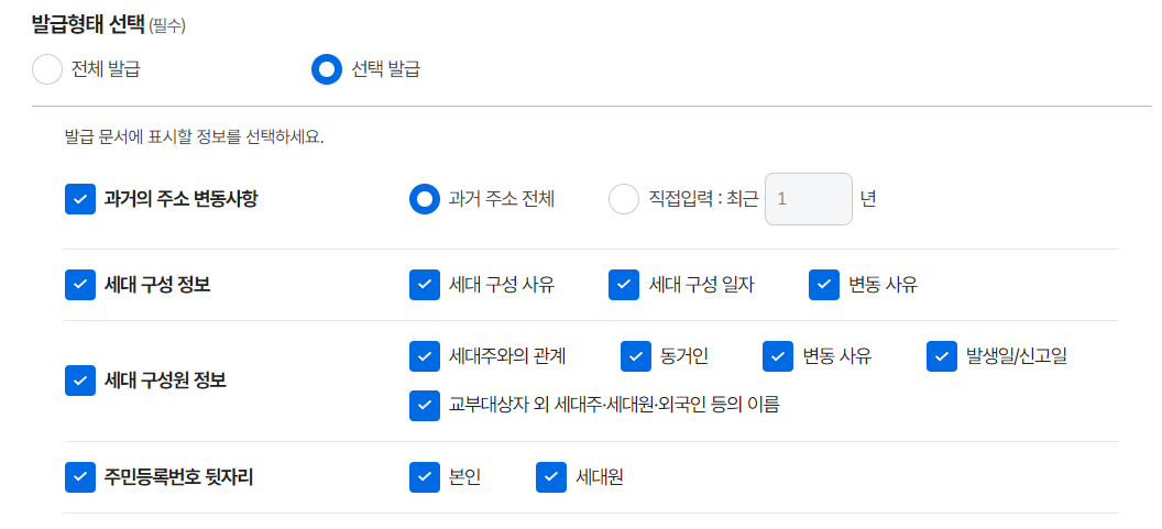 선택발급을 할 경우 과거의 주소변동사항, 세대 구성 정보, 세대 구성원 정보, 주민등록번호 뒷자리를 선택하여 원하는 정보만 보이게 발급을 받을 수 있습니다.
