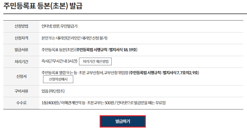 신청방법으로는 인터넷, 방문, 무인발급기가 있으며 처리기간은 즉시 가능합니다. 수수료는 1통에 400원인데 인터넷발급시에는 무료이니 인터넷으로 하시길 바랍니다. 발급하기 버튼을 클릭합니다.