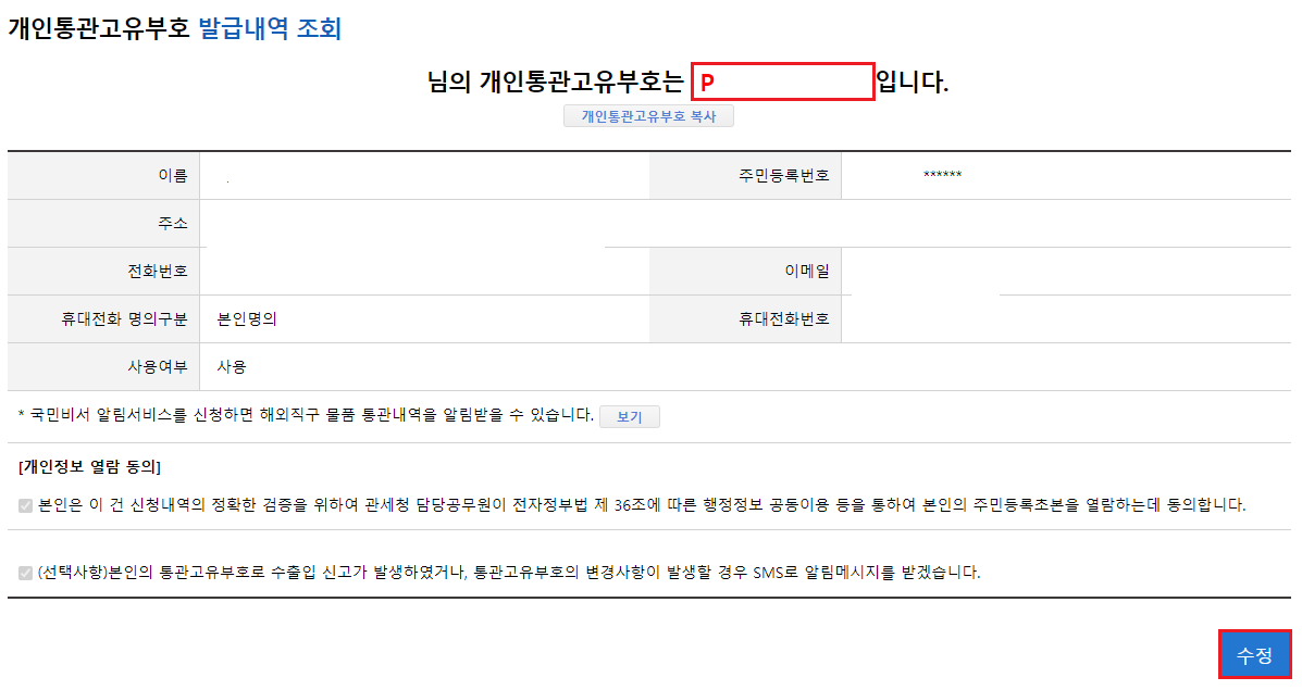 통관번호조회, 관세청 개인통관고유부호 조회가 되었습니다.