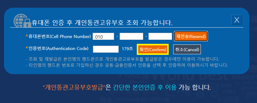 간편 본인인증 서비스를 거쳐야 통관번호 조회가 가능합니다.