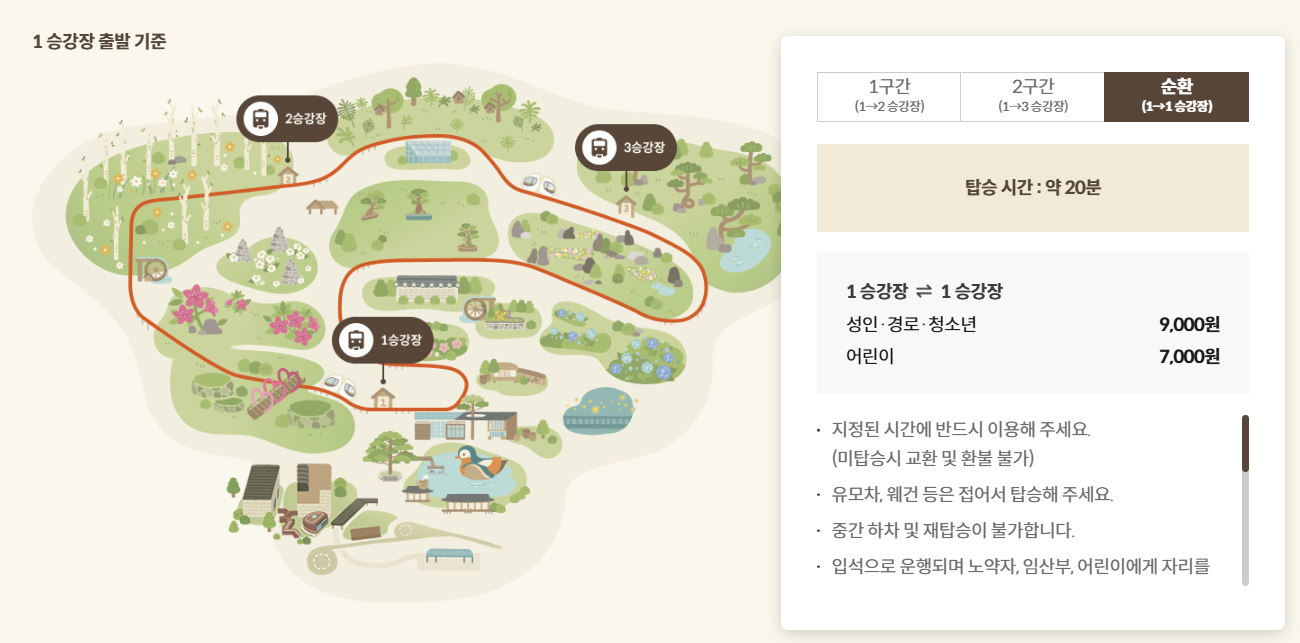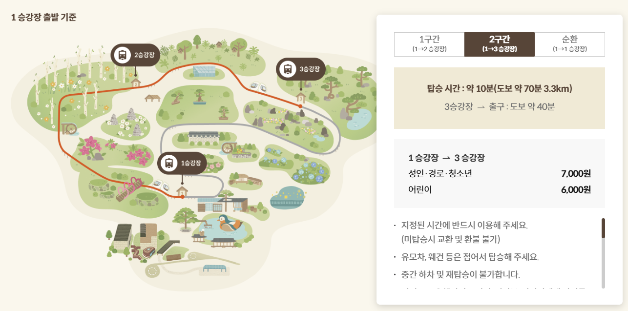 - 편도 요금: 1구간 성인 5,000원 / 어린이 4,000원, 2구간 7,000원 / 어린이 6,000원